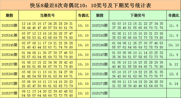 福彩快乐8第2025277期开奖回顾:09 11 13 14 20 22 39 43 48 52 54 55 57 64 68 69 72 73 75 80,其中奖号奇偶比为10:10,大小比为13:7,012路比为8:7:5。