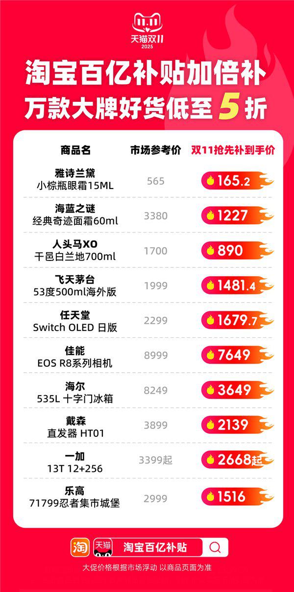 10 月 15 日晚 8 点,天猫双 11 正式开卖,淘宝百亿补贴重磅加码,精选手机、家电、美妆、运动户外、服装、食品、宠物、潮玩等行业万款大牌好货,在日常全网底价的基础上,再发放“百亿金刚券”及专享红包,每天 10 点起可领 3300 元,大牌爆款低至 5 折。