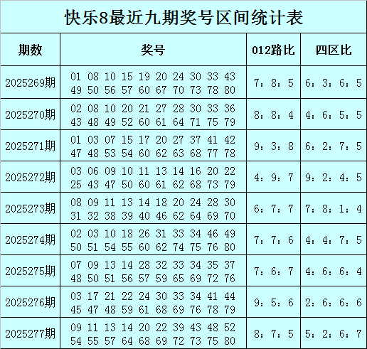 福彩快乐8第2025277期开出奖号:09 11 13 14 20 22 39 43 48 52 54 55 57 64 68 69 72 73 75 80,其中奖号012路比为8:7:5,四区比为5:2:6:6。